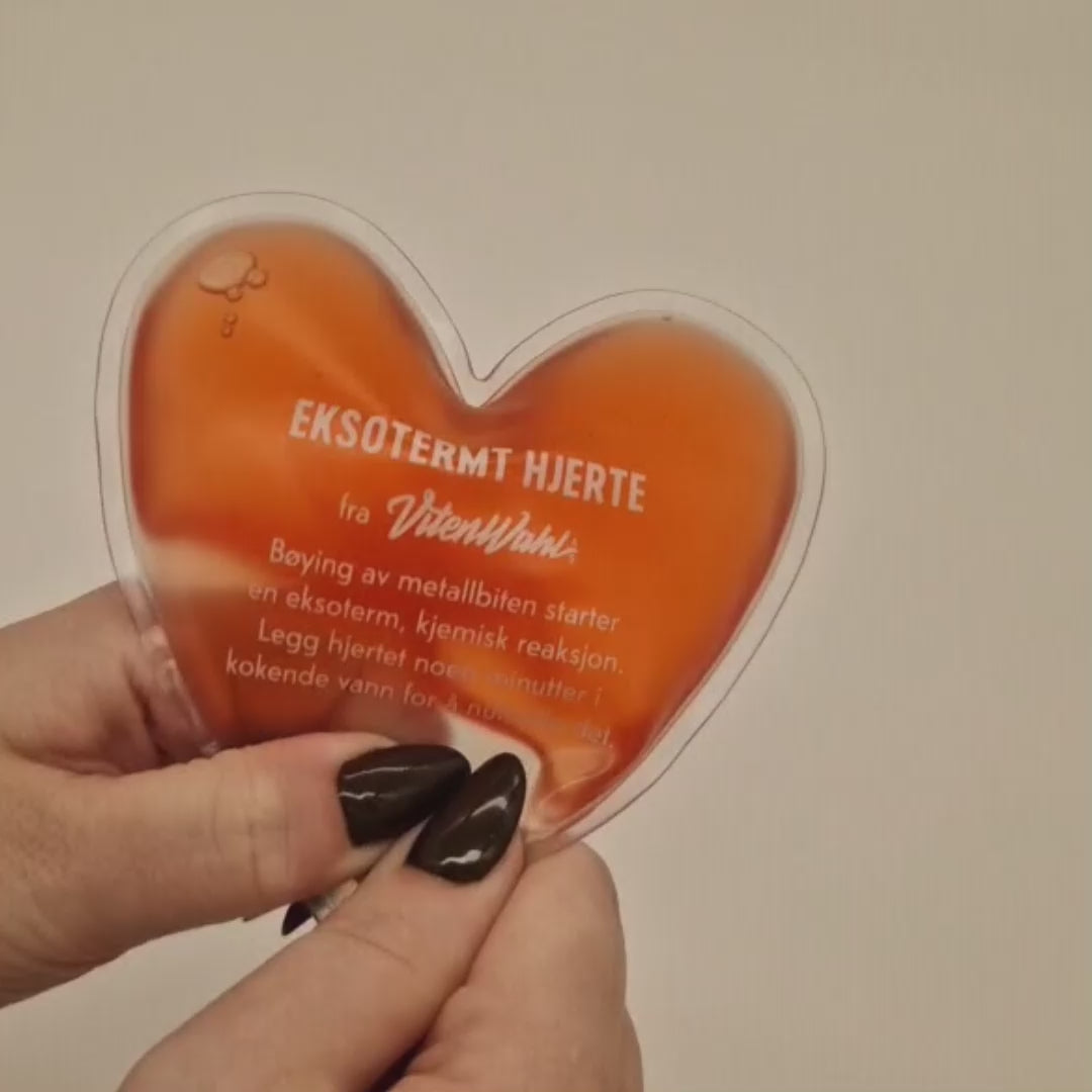 Du mottar et hjerte fylt med flytende væske og en liten metallbit. Bøy metallbiten til du hører et knepp, og se krystalliseringen utfolde seg og varmen strømme på. Nå vil hjertet holde deg varm en halvtimes tid ved hjelp av en eksoterm, kjemisk reaksjon.