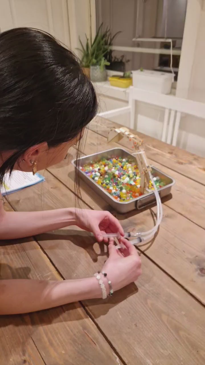 Med dette byggesettet kan du lage en gravearm med to ledd som fjernstyres av hydrauliske stempler. En utmerket innstegsmodell for ingeniørspirer og unge maskinførere. Eller et nyttig verktøy for å forstå hydrodynamikk på veldig lavt nivå. Byggesett i 52 deler, inkludert deler i presisjonskuttet finér, sprøyter, slanger, akslinger, skruer, gummiskiver og strips.