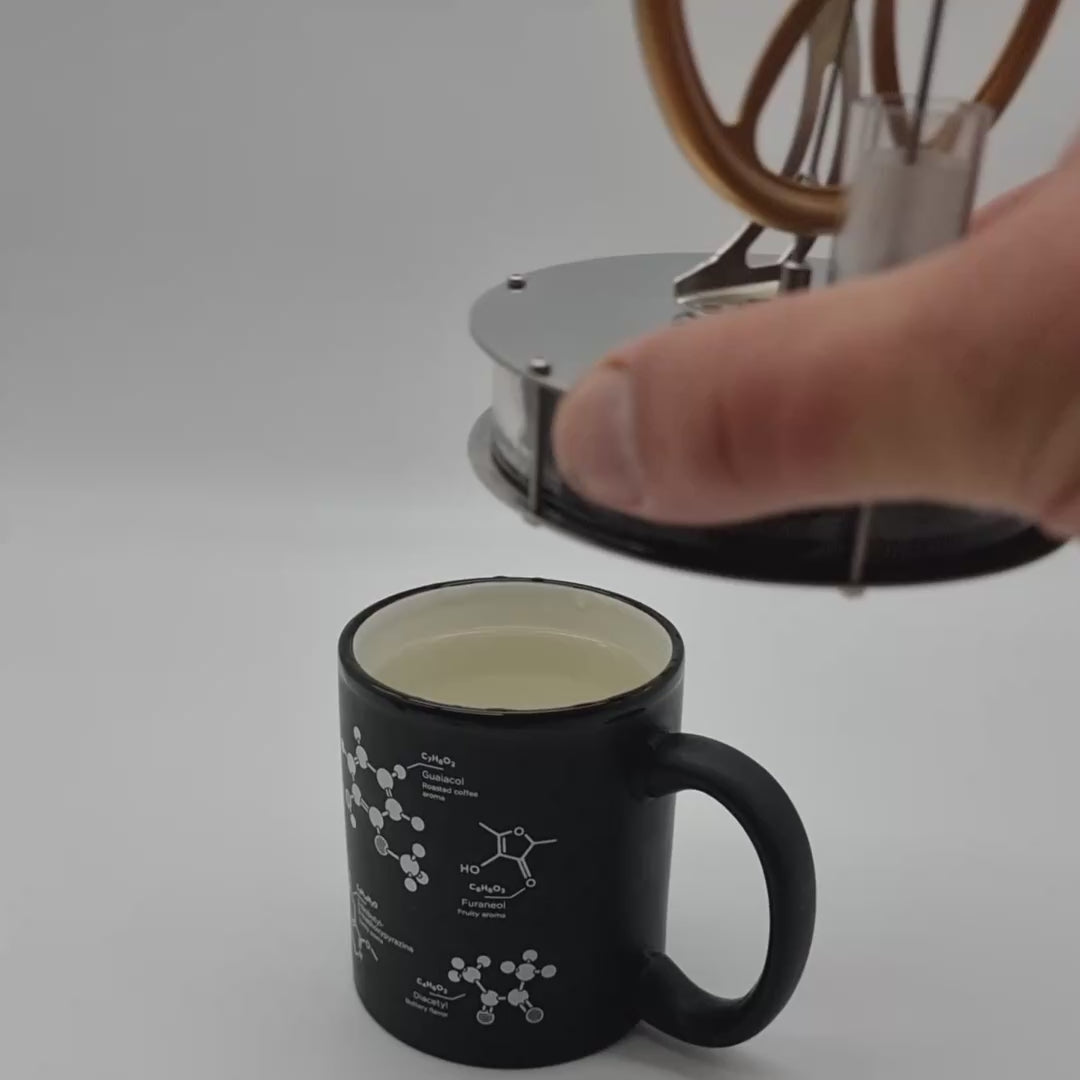 Sett Varmekraftmaskinen på en kopp med noe varmt i, vent et halvt minutt, gi den en liten dytt og se den spinne.